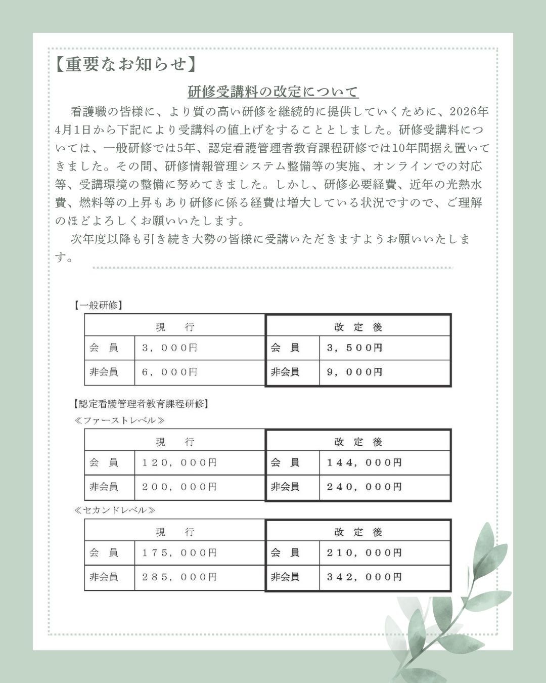 【重要】 研修受講料の改定についてお知らせ